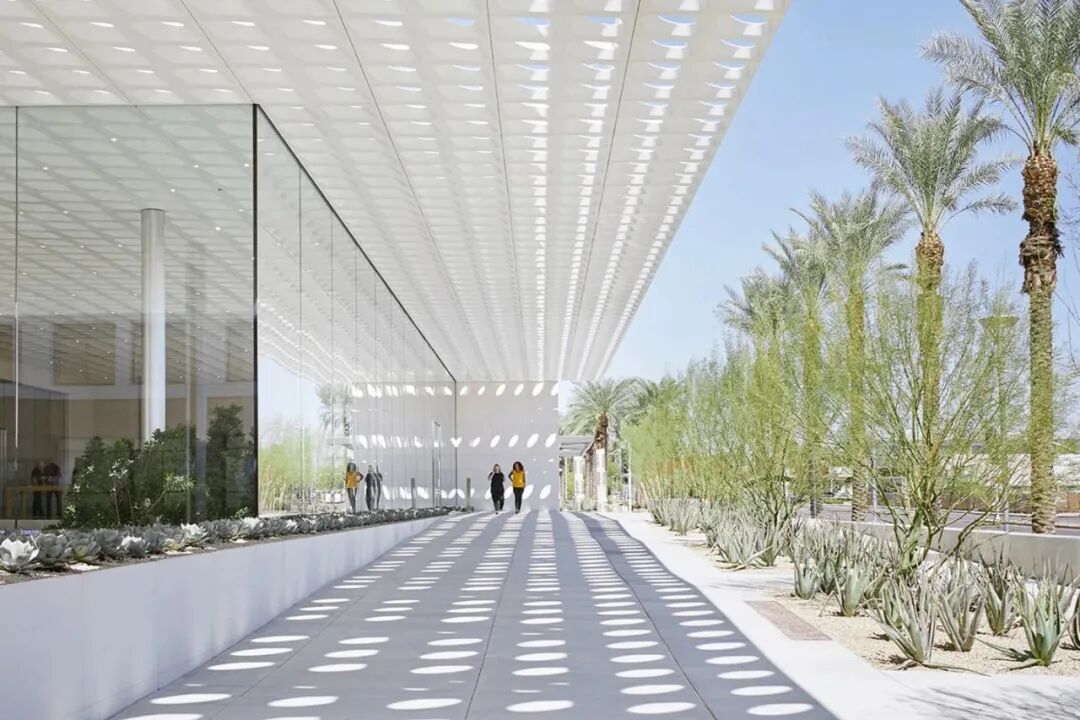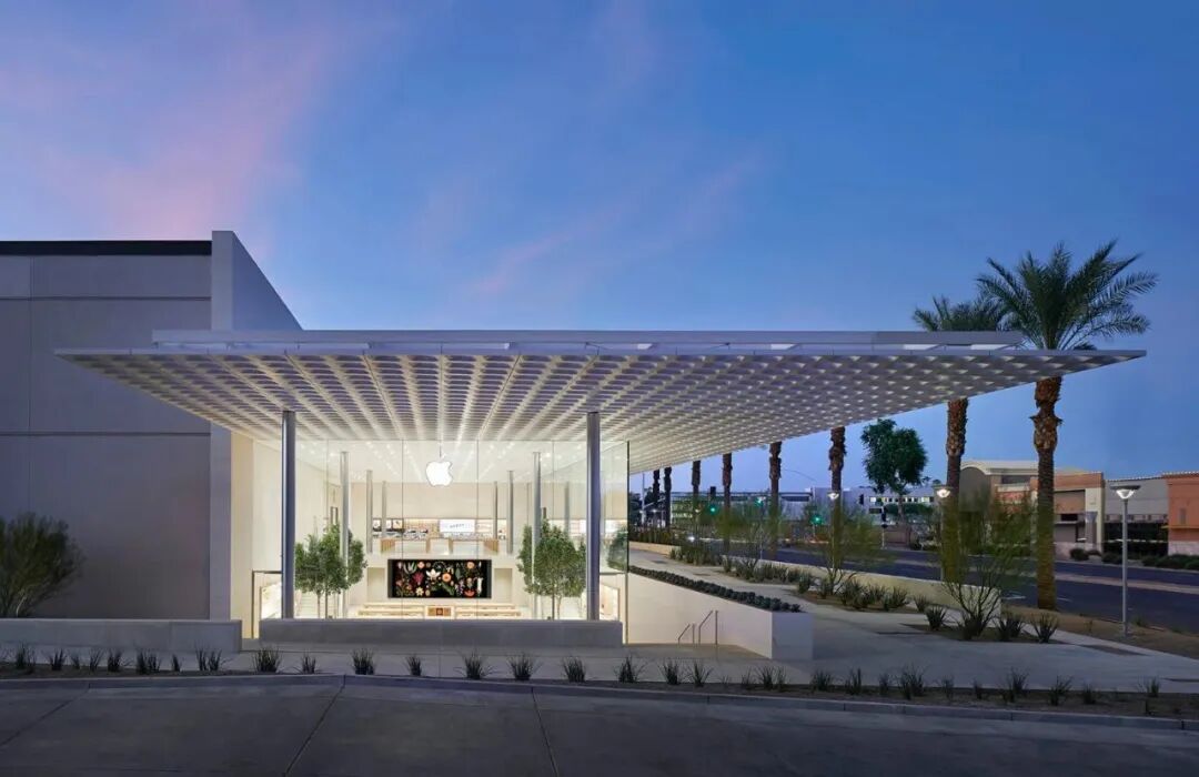 科茨代尔时尚广场苹果旗舰店可以说是苹果麾下最具特质的旗舰店之一。悬挑式屋顶由室内空间向外延伸,创造了与众不同的光影效果和遮光区域。